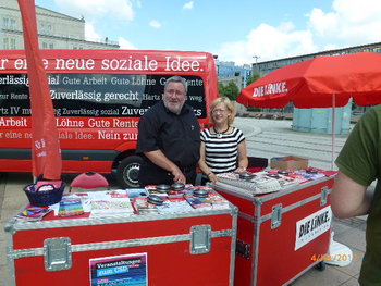 Markranstädt. „Auf uns rollt eine Welle von Altersarmut zu“, davon ist Axel Troost, Bundestagsabgeordneter der Linken und deren stellvertretender Bundesvorsitzender überzeugt. Deshalb kam er diese Woche mit der Leipziger Bundestagsabgeordneten Barbara Höll und dem Infomobil der Partei auf den Markt in Markranstädt, um mit Bürgern zu diskutieren. Ihr Thema war die soziale Altersabsicherung. „Schon jetzt klagen viele Rentner, dass sie bei steigenden Energie- und Lebenshaltungskosten nicht zurechtkommen“, sagt Troost. „Und die zukünftigen Rentner wird es noch härter treffen, da deren Rentenniveau nach den Plänen der Regierung ohnehin drastisch sinken wird. Sie werden ihren Lebensstandard kaum halten können. Und dabei reden wir noch nicht von den prekär Beschäftigten“, ergänzte Höll.