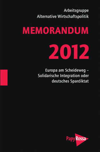 „Die Arbeitsgruppe Alternative Wirtschaftspolitik analysiert in ihrem MEMORANDUM 2012 die aktuellen Verwerfungen, die die Eurokrise verursacht hat, und setzt der herrschenden Austeritätspolitik (Austerität: Sparsamkeit) einen alternativen Entwicklungspfad entgegen, der den europäischen Ländern die Chance bieten würde, aus der Krise herauszukommen. Die Ursachen, aus denen die Finanzmarktkrise erwachsen ist, wurden bisher in keiner Weise behoben. Um Lösungsmöglichkeiten aufzuzeigen, enthält das MEMORANDUM Vorstellungen, wie der Finanzsektor neu zu strukturieren und mit einer strengen Regulierung auf eine für die Volkswirtschaft nützliche Funktion zurückzuführen wäre. Außerdem wird die Gestaltung einer »High-Road für die Dienstleistungsgesellschaft « am Beispiel von Pflege und Alltagsunterstützung älterer Menschen aufgezeigt.