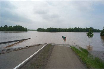 In Markkleeberg und Böhlen war die Lage derweil wieder entspannt. Besondere Hilfestellungen waren vor Ort nicht weiter benötigt und so fuhren wir noch in das "Grenzgebiet" zu Thüringen. Kurz vor Treben mussten wir jedoch stoppen, weil dort die Landstraße aufgerissen werden musste. Ein Deich war gebrochen, das Wasser überflutete die dortigen Kleingärten und bedrohte die nahegelegene Stadt. Durch den Straßenaufbruch konnte das Wasser abgeleitet werden. Die Altenburger Landrätin der LINKEN, Michaele Sojka, empfing uns auf der anderen Seite des Grabens und wir sahen uns die Lage in Treben noch genauer an. Michaele berichtete uns auch von einem verzweifelten Bürgermeister, dessen Kommune nicht weit entfernt komplett vom Wasser eingeschlossen war.