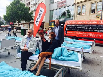 Die Dresdner Aktionskünstlerin Eva Olivin entwickelte im Auftrag der Fraktion DIE LINKE im Deutschen Bundestag zum Thema "Gesundheit ist keine Ware" die Kunstinstallation, die im Rahmen einer Tour in Sachsen präsentiert wird.