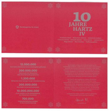 Unlängst versandte die Bundesagentur für Arbeit an Parteien, Fraktionen und Abgeordnete eine Weihnachtskarte mit der Aufschrift „10 Jahre Hartz IV“. Darauf zu lesen waren die Lorbeeren, die Sahnestückchen, ja das Fruchtfleisch, aus dem Hartz IV aus der Sicht seiner Macher zu bestehen scheint.
