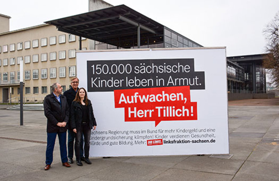 Die angesprochene Plakat-Aktion trägt das Motiv: „150.000 sächsische Kinder leben in Armut. Aufwachen, Herr Tillich! – Sachsens Regierung muss im Bund für mehr Kindergeld und eine Kindergrundsicherung kämpfen! Kinder verdienen Gesundheit, Würde und gute Bildung.“