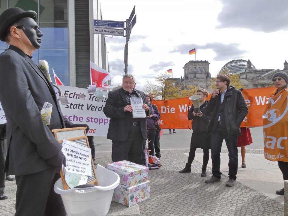 Die Bundesregierung verpatzt gerade eine wirkungsvolle Umsetzung der vierten EU-Geldwäscherichtlinie, und damit den Kampf gegen Steuerhinterziehung, Geldwäsche und Korruption. Deswegen haben heute Attac, das Netzwerk Steuergerechtigkeit, das Tax Justice Network und WEED vor dem Bundestag protestiert. Anlass war die öffentliche Anhörung im Finanzausschuss des Bundestags zu dem Gesetzentwurf der Bundesregierung.