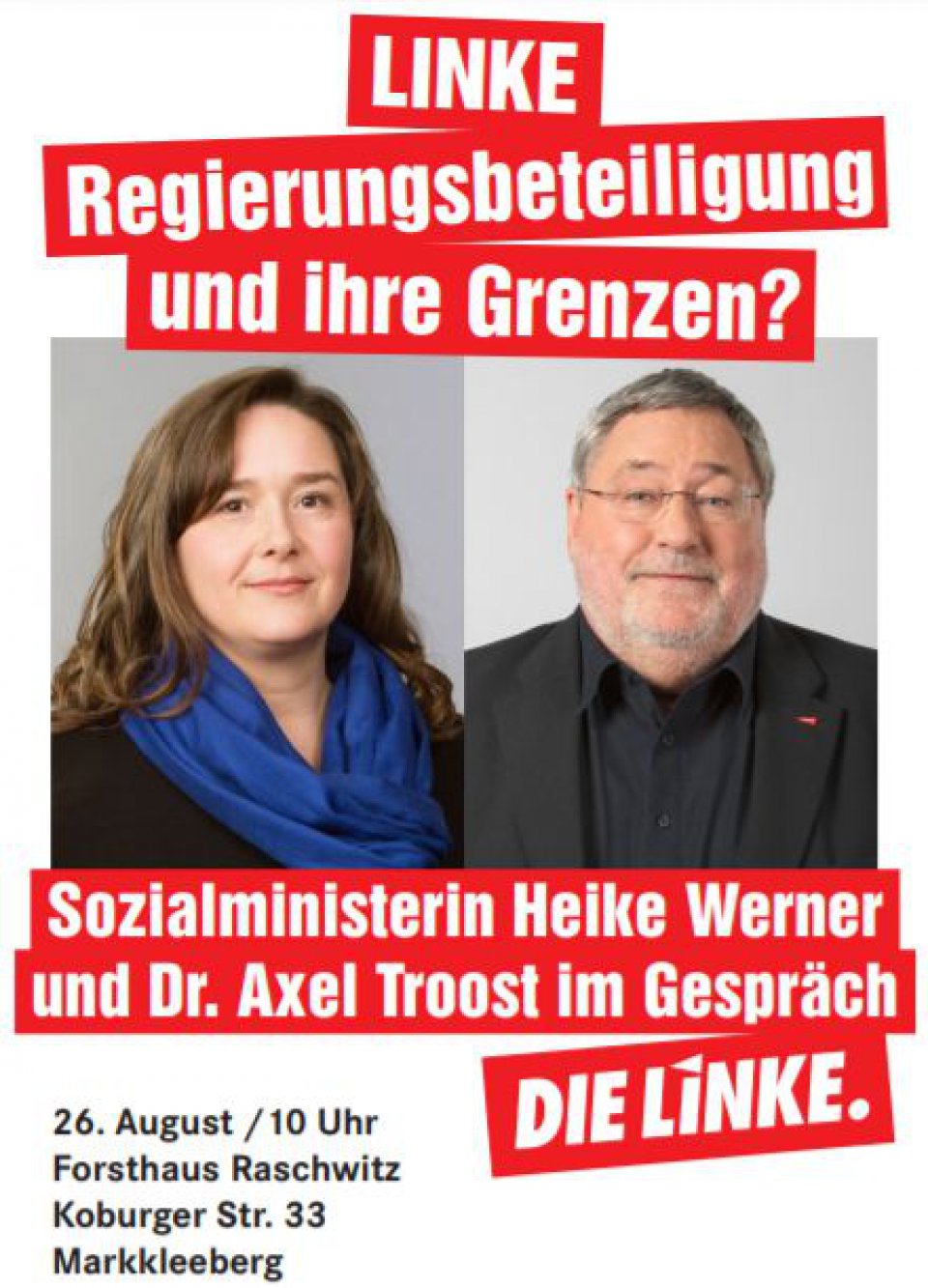 Unter dem Titel „LINKE Regierungsbeteiligung und ihre Grenzen?“ spricht die langjährige Markkleebergerin über Erfolge und Schwierigkeiten als LINKE Ministerin. Dabei wird Sie vom Bundestagsabgeordneten Dr. Axel Troost flankiert, der mit seinem finanzpolitischen Sachverstand Grundlagen für eine potentielle Regierungsbeteiligung im Bund legen möchte.
